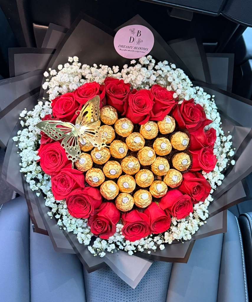 A heart-shaped bouquet with fresh red roses, baby's breath, and delicious chocolates. The perfect gift to surprise and delight.