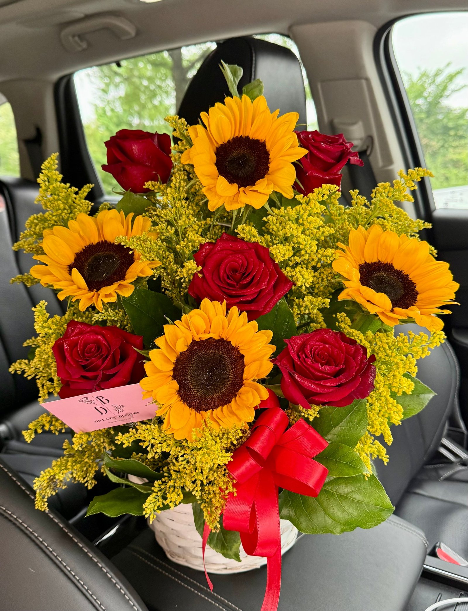 A charming basket arrangement that combines the radiant energy of sunflowers with the intensity of red roses. Inspired by enchanting sunsets, created to illuminate any special moment. 🌻